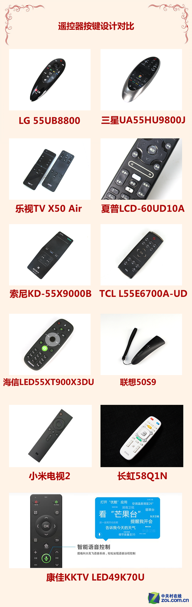 除了菜单结构和操作界面之外,遥控器的按键设计也同样非常重要,对于追求用户体验的电视厂商而言,两者通常是紧密结合在一起的,下面我们就来看看它们的遥控器按键设计。