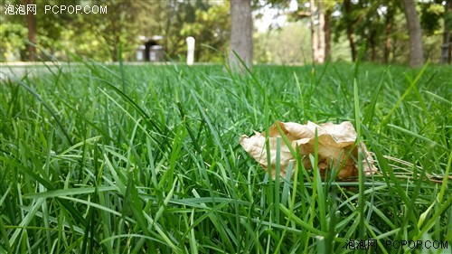 比如就拍普通的绿地,正面拍摄平淡无奇,满屏绿色毫无特点,但是换个角度,从侧面来看拍,借助枯叶来衬托绿地,效果就不一样了。