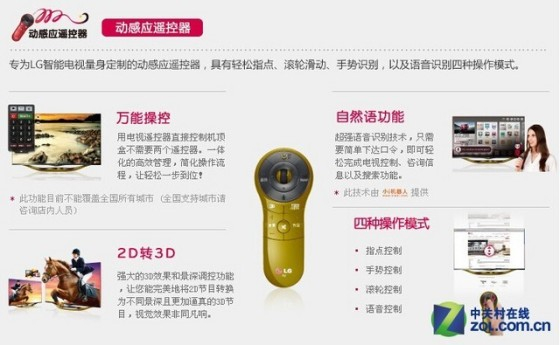 LG 47LA6880智能电视配备的动感遥控器,功能十分强大,能够实现轻松指点、滚轮滑动、手势识别以及语音识别四种操作模式,使得用户操控更加的智能便利。此外电视还具有多屏互动、视频点播、局域网分享等丰富的功能。