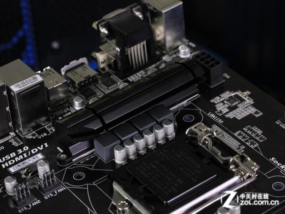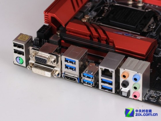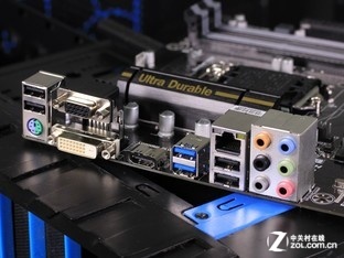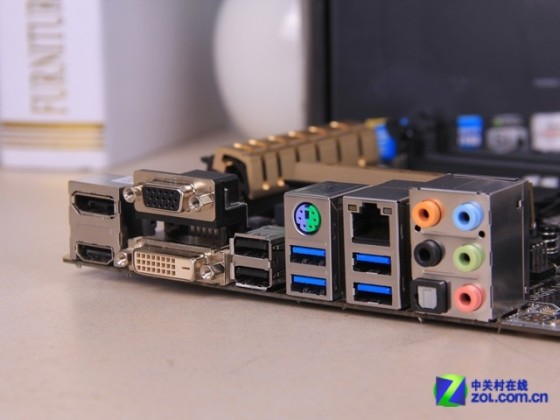 该主板的内存部分,则带有4条DDR 3插槽,支持用户组建双通道内存平台。背板接口部分,带有1组VGA/DVI/HDMI视频输出接口,1组PS /2键鼠接口,2个USB 3.0接口,4个USB 2.0接口,1组同轴/光纤接口,1个千兆网络接口,1组8声道音频接口,方便用户扩展各种设备。