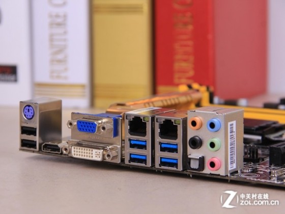 主板的背板部分,提供了2个USB 3.0接口,4个USB 2.0接口,1组VGA/DVI/HDMI高清视频接口,1个PS/2键鼠通用接口,1组 网络及音频接口。磁盘接口部分,则包括4个SATA 3.0接口和2个SATA 2.0接口,满足了多磁盘用户的扩展需求。