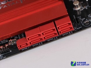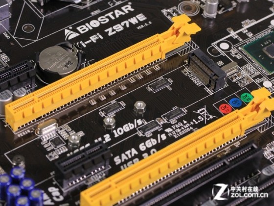 主板的PCI扩展部分,带有3条PCI-E x16高速插槽,3条PCI-E x1插槽,支持双路SLI及三路CrossFireX,能够满足不同玩家 的显卡扩展需求。磁盘接口同样非常丰富,包括6个SATA 3.0接口,1组SATA Express接口,1个高速M.2接口。其中M.2接口和 SATA Express接口可以提供10Gb/s的理论带宽速度,进而发挥出SSD更快的读写速度潜力。