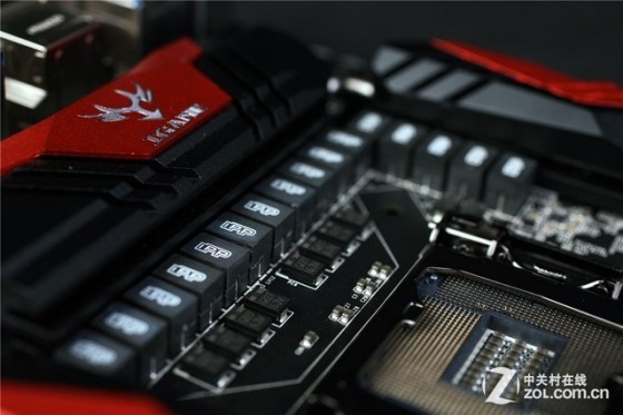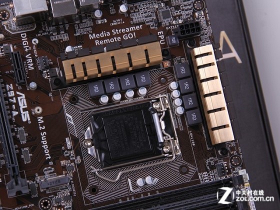 华硕Z97-A的核心供电采用了8相供电设计,对于一款实惠的Z97超频主板这样的规格还是令人满意的。mosfet供电芯片上方也加设了面积偏大的散热片设计,保证了平台在高负载下也能有良好的散热保障。