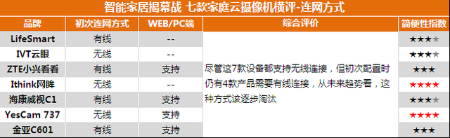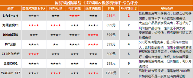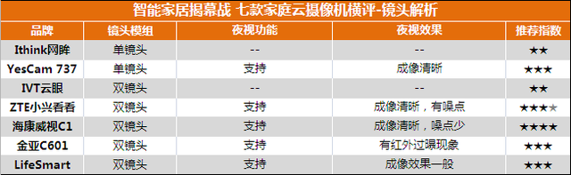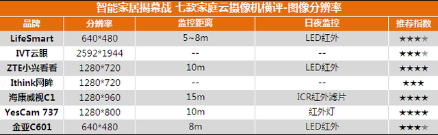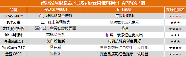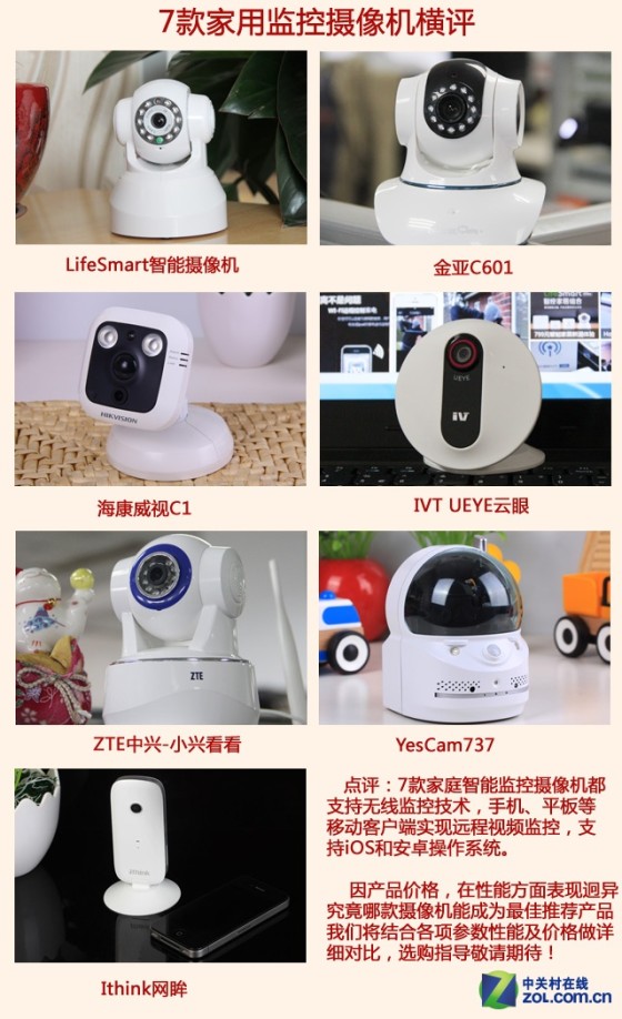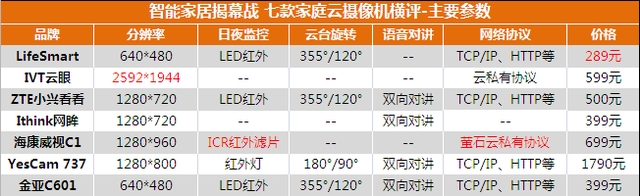 不同厂家对家庭摄像头有着不同的理解,关爱、分享、安全等不同主题直接影响着摄像机的功能,在本次横评的七款家用云摄像头中,包括海康威视C1、ZTE 中兴"小兴看看"C520、Ithink网眸、LifeSmart家庭摄像头、IVT高清云眼、YesCam 737和金亚C601。