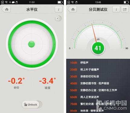 另外两个有趣的功能分别是水平仪和分贝测试仪。水平仪大家都见过,是根据水管中的气泡走向来确定水平面位置的,它通常用于机械测量,如车床、作 业平台等等。但是在日常生活中我们同样有用到水平仪的机会,摆放专业摄像机时,在墙上悬挂照片时等等,虽然用到的次数不多,但是有备无患总是没什么坏处。