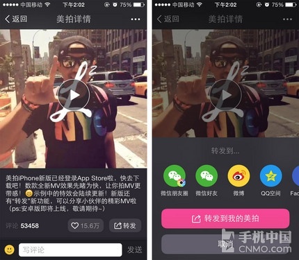 首先请大家将手机中的《美拍》升级至最新版本(V1.2.0),在首页上您可以欣赏到来自世界各地的美拍作品,温情唯美、轻松活泼,有创意的人 总是能拍摄出与众不同的画面。想要将它分享给朋友一起欣赏吗?只要点击一下视频下方的“转发”就可以啦!朋友圈、微博、QQ空间,这些主流的分享平台《美 拍》通通支持,这下好东西再也不会一个人独享了。