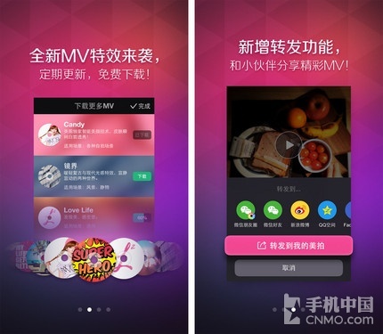 作为时尚潮人怎么能不知道《美拍》呢?它是美图秀秀旗下的一款美化类应用,但是它的主要美化对象由照片变为了视频,虽然只有短短的十秒,但是 《美拍》却有化腐朽为神奇的魔力,只要加上内置的特效和精心配合好的背景音乐,再枯燥无味的内容也可以媲美精致的MV。美拍此次更新,加入了多款全新MV 特效,背景音乐也有更多可选择性,除此之外,当您欣赏他人的MV作品时,也可以进行转发分享,让更多的小伙伴加入进来。接下来我们就一起来欣赏新特效的精 彩吧。