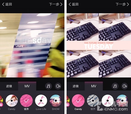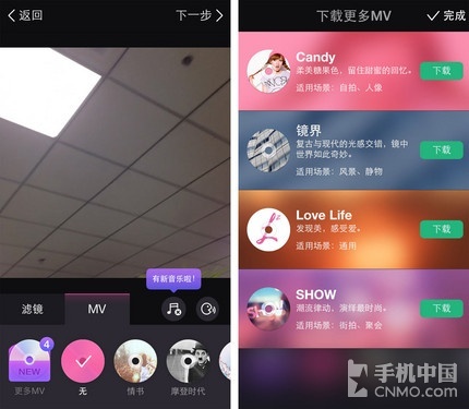 那么最重要的MV特效在哪里下载呢?只要您和平常一样拍摄好需要美化的视频,点击下一步进入到编辑界面,在所有MV特效的最前面,有个明显的 “更多MV”选项,在这里您会发现有四款全新的MV特效正在等着您下载。Candy、镜界、Love Life、SHOW,每一款下面都带有效果的说明和适用场景,不用再犹豫不定使用哪一款了,《美拍》会给您最专业的指导。