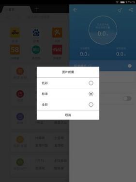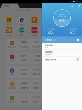 得益于U3内核的强大性能,UC浏览器HD 3.4在开启极速模式后,可以让用户自由选择省流强度,不仅能够选择低彩、标准、全彩三个等级的图片质量,同时还能选择缩放排版和适应屏幕两种浏览模式, 甚至还可以选择是否优先访问简版网页,全面帮助用户节省40%以上的流量。此外,UC浏览器HD 3.4还能显示为用户节省的流量,今日使用流量和本月使用流量一目了然,让流量尽在掌控之中。