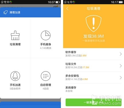 手机中的垃圾主要由缓存、卸载后的残余文件、多余的安装包等构成,体检只是清理了其中的一小部分,想要给手机来个彻底的大扫除,还是要求助于 “清理加速”的仔细搜索,力求对每个细节都不放过。除了应该立即清除的垃圾缓存外,手机中的大型文件也会吃掉大部分的存储空间,让手机变得臃肿不堪行动迟 缓,还好小编开启了定期整理功能,免去了为应用搬家的麻烦。