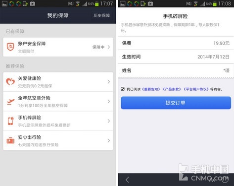 新版支付宝钱包的菜单发生了一定变化,大家可以在“财富”中看到新加入的“我的保障”,“手机碎屏险”就隐藏在这里。首先小编为大家解释一下到 底什么是“碎屏险”,这是支付宝和华泰保险联合推出的保险产品,只要花上19.9元的保费,当您心爱的手机因为意外而碎屏,那么支付宝将全额赔付。