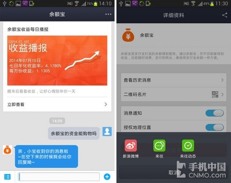 除了功能的多样化之外,支付宝更重视用户与商家之间的沟通,服务窗就是一个非常好的交流平台。在支付宝钱包V8.2版中,允许用户直接在界面中与商家聊天,就像面对面那样直接。要是您觉得服务窗的内容还不错,那就直接分享给微博或者来往上的小伙伴们吧。