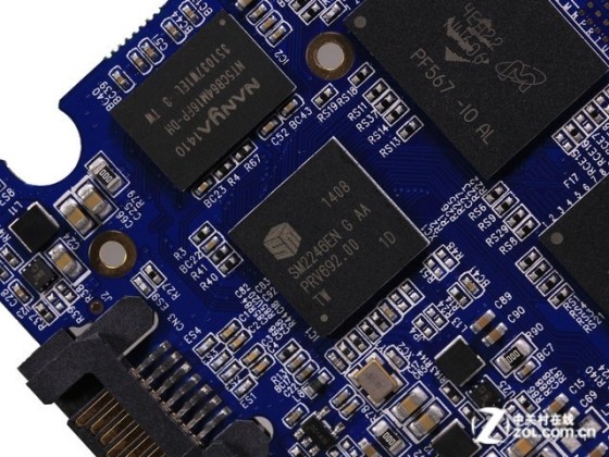 金速F9 128GB SSD仅采用了2颗事必达20nm ONFI闪存颗粒,而事必达则是镁光的全资子公司,颗粒上我们可以看到不仅有镁光logo,还有事必达的logo,两者叠加起来略显凌乱。