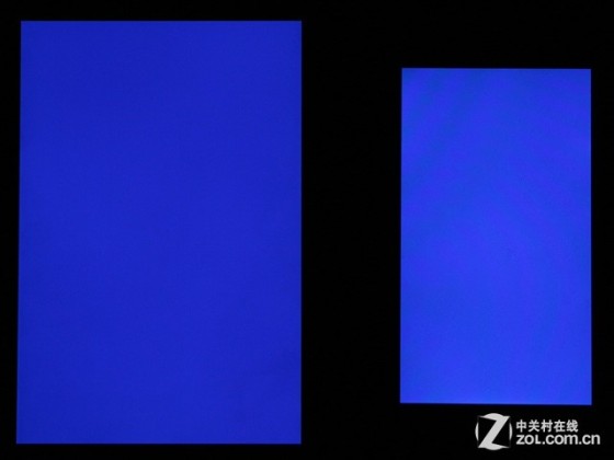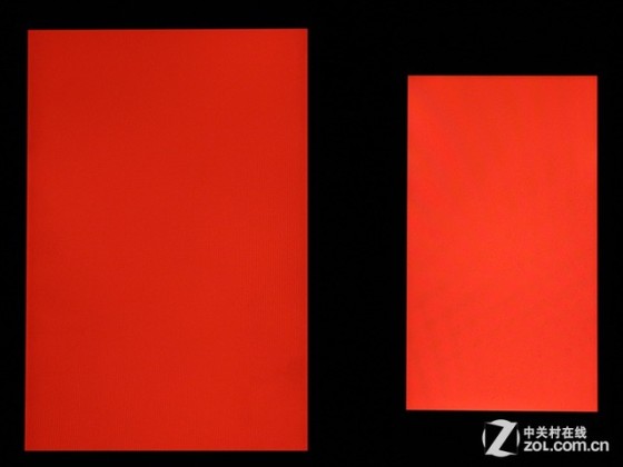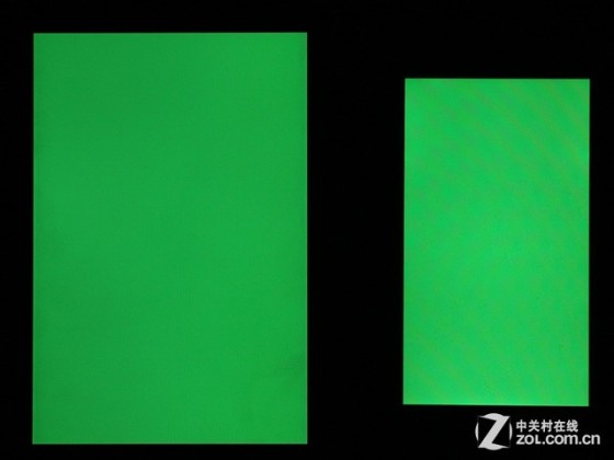 从三原色的显示效果实拍图片来看,在对比iPhone 5的条件下,同为最高亮度下的华为Mate 7在显示红绿蓝三色时颜色更偏向鲜艳取向,很讨好眼球。三原色色彩饱和度较高且比较均匀,作为手机来说已经很不错了。