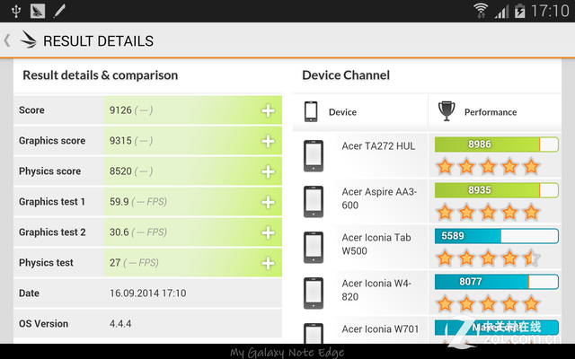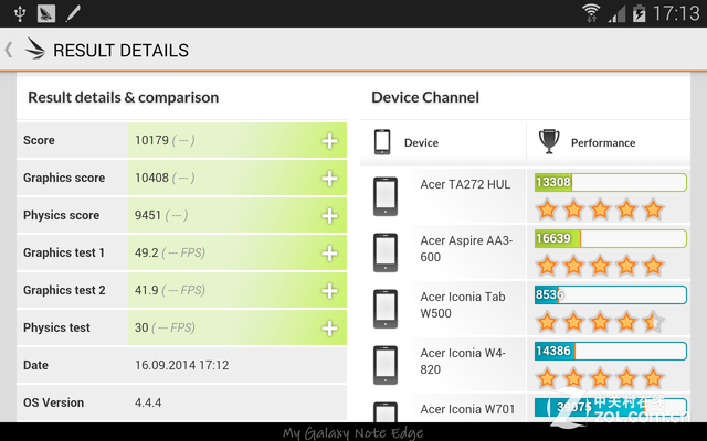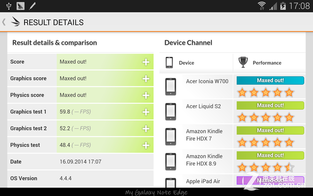 至于3DMark的三种场景测试,GALAXY Note Edge也是纷纷位于最前列的。