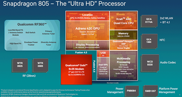 骁龙805采用了四个Krait 450核心(骁龙800/801均使用了Krait 400),依然为28nm工艺制程。最高主频可以从骁龙800、801时代的2.5GHz飙升至2.7GHz(实际频率2.65GHz左右),所有核心共享2MB大小的二级缓存。该芯片的内存带宽达到了25.6GB/s,并且集成Adreno 420图形处理器,官方宣称该GPU相比Adreno 330提升了40%。