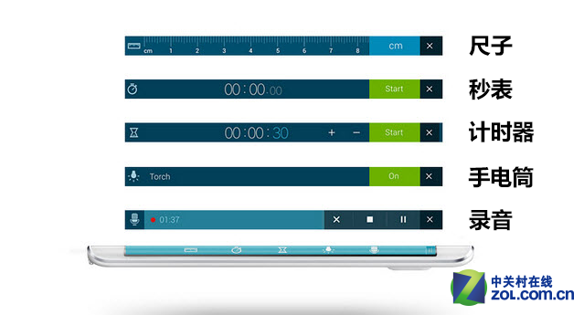 目前的侧边屏幕可以在两大模块之间切换,其一是一些基本工具的集合,有尺子、秒表、计时器、手电筒和录音功能,不需要进入相应的APP,通过侧边屏幕就可以快速开启这些功能。虽然有时候侧边屏幕的视角方向会跟正常使用手机时冲突,不过总体而言还是很讨巧的设计。