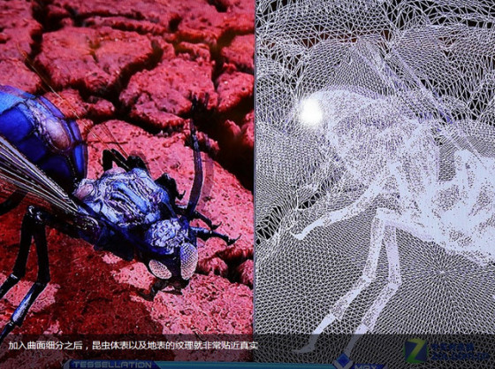 图形方面新采用的Adreno 420 GPU支持动态硬件曲面细分技术,来以更加细小的笔触刻画真实的现实世界。从这里的游戏Demo可以看出昆虫的身体在进行曲面细分放大之后细节非常丰富。