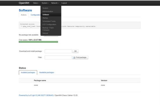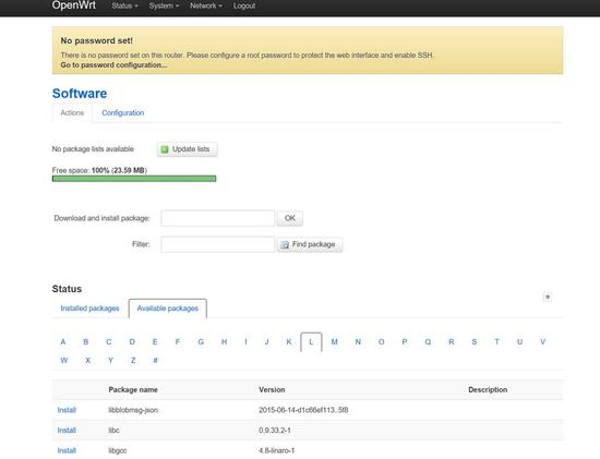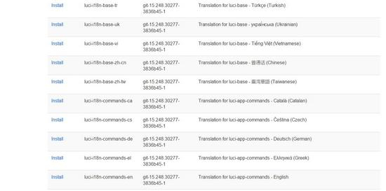 页面下半部分Status默认在Installed packages页面,我们点击Available packages,显示更新之后的软件包。点击L分类,下拉找到luci-i18n-base-zh-ch ,基础中文包,点击安装~