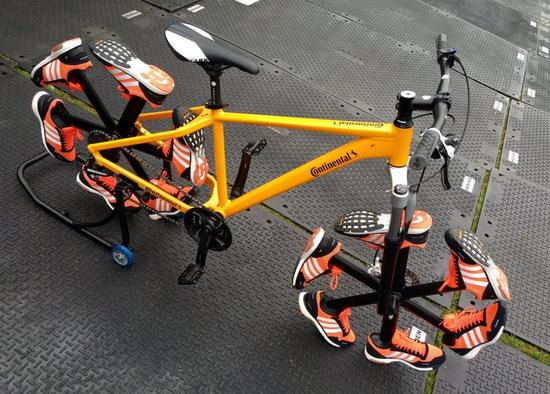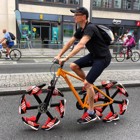 这辆自行车最独特的设计在于它的轮胎。与以往普通的橡胶轮胎不同,这次的轮胎变成了一个个颜色鲜艳的跑步鞋。前后两个轮胎上各装有 6 只红黑配色为主的运动鞋。车轮运转起来就像人脚上穿着运动鞋在跑步一样。