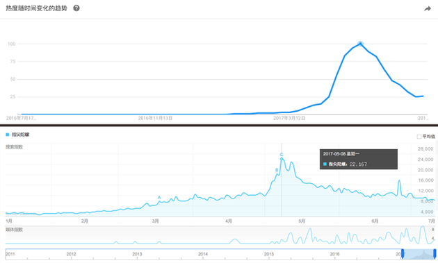 不过,人们对这场玩具大流行投入的热度似乎已经开始回落。从谷歌趋势提供的数据看,对指尖陀螺关注度在2017年5月下旬达到峰值,现在刚开始流行时的水平。在中国,近两月人们来用百度搜索“指尖陀螺”的次数呈现出平缓下降趋势,但是相比较之前基数仍然是有成倍的提高。