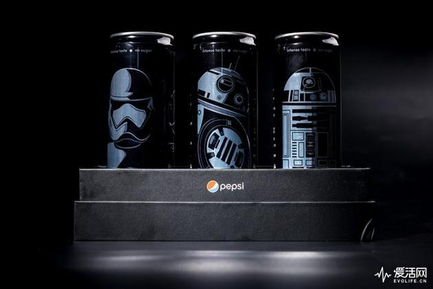 绝不放过潮流文化的百事可乐,当然不会错过《星球大战》的新片。在首映之前,百事可乐推出了它最新的星球大战系列限量罐。科技风的纯黑底色,配上黑武士、BB-8、R2D2、白兵等一些列形象。对于粉丝们来说,恐怕这将是他们最不舍得扔掉的可乐罐了吧。