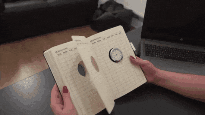 设计者在日记本的中心位置安放了一个真正的时钟,用于不断提醒完成任务所需的时间。而为了能随时看到时间,整个日记本每一页纸的中间都有一个大洞……