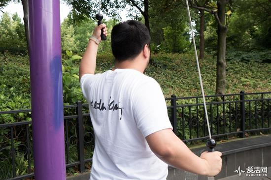 相比前面几个,这个太极云手就轻松多了,它是以太极拳的练习方法之一的太极推手作为基本锻炼形式。太极推手是两人面对面,手臂相达,运用捊、挤、按等手法,按一定顺序相互推挽,而这个太极云手器械模拟了对手,你只需顺时针或逆时针转动转盘即可,记住,一定要匀速,不可用力过猛。
