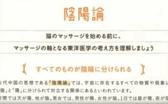 猫咪按摩还涉及“阴阳说”、“五行说”、“经络和穴位”、 “给猫咪按摩时的注意事项”、“基础按摩手法”等。