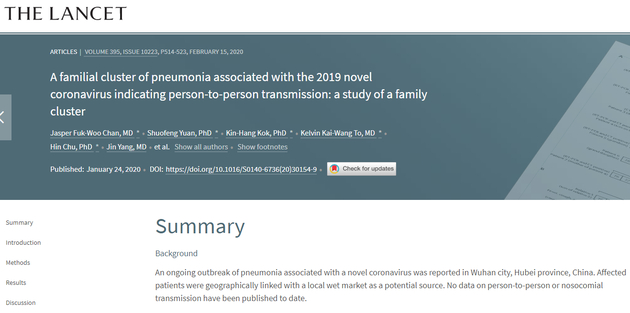 A familial cluster of pneumonia associated with the 2019 novel coronavirus indicating person-to-person transmission: a study of a family cluster, 柳叶刀,1月24日