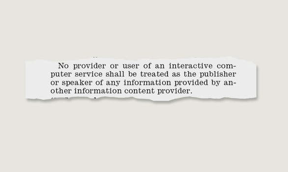 到底什么是第230条款?1996年美国《通讯规范法》(Communication Decency Act)的第230条规定,“任何交互式计算机服务的提供商或者用户不应被视为另一信息内容提供商提供的任何信息的发布者和发言人。”换言之,这些互联网公司无须为第三方或用户在他们平台发布的内容承担责任。