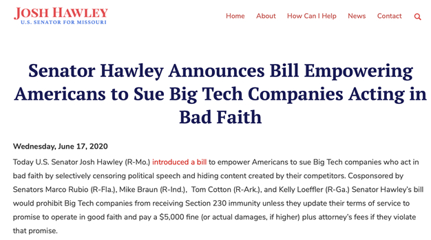 主笔议案的密苏里州共和党参议员霍利(Josh Hawley)声明称,Twitter、Facebook和谷歌等大型科技公司长期以来借助他们的力量噤声保守派的政治言论,没有给用户提供任何依据。第230条款已经被各个法庭扩大和改写,给了这些科技公司不必担责的言论(审核)权力。国会应该采取行动,确保那些审查和噤声对手言论的不良公司不能享受这一免责待遇。