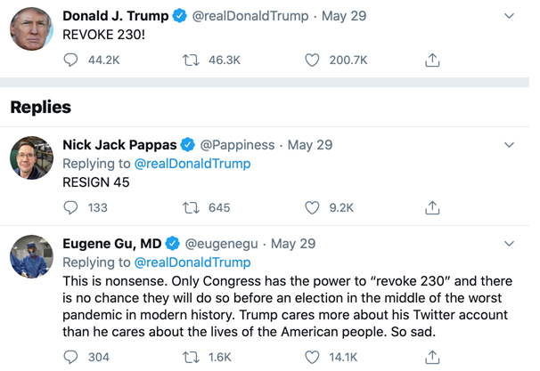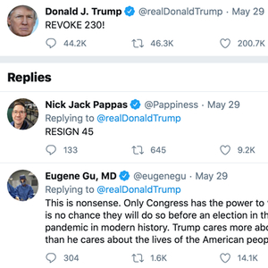 “Revoke 230!”5月29日,美国总统特朗普在Twitter上这样写道。那天他正式签署行政命令,要求联邦政府对社交媒体的免责条款作出限制。所有人都知道这是在针对Twitter。在那个星期,Twitter连续给他的推文打上了“需要事实核查”以及“颂扬暴力内容”的标签,暴怒的特朗普直接威胁要关了Twitter。