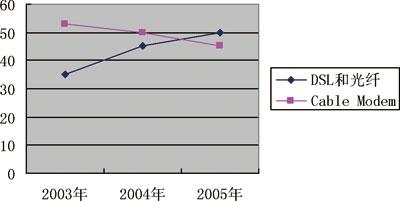 从近几年美国宽带接入市场发展的轨迹上,也可以很清楚地看出两者的增长情况。FCC公布的数据(如图所示)显示,在宽带接入方面,2002年底美国宽带用户中CableModem为1130.7万户,占总数52.7%;DSL为644.44万户,占总数的32.6%;光纤为55.35万户,占总数的2.8%;卫星与其他为146.28万户,占总数的7.4%。可见,CableModem市场份额占的最大;但到了2004年初,DSL及光纤的市场份额迅速攀升到45%以上;2005年,全美宽带用户总数达到4290万户,DSL新增超过520万户,CableModem新增440万户,这一年DSL用户首次使增长数量超过了Cable Modem用户数,这是个历史性的突破,至此以后,有线电视公司处处被动。