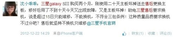 类似遭遇的还有北京的胡女士。2012年“十一”假期期间,胡女士买了一款三星i9300手机,正常使用约两个月后,“12月中旬的一天,手机放在裤兜里,再拿出来的时候就一直停留在开机的画面——死机了,怎么按都不成,只能通过拔电池才能关机,再开机还是如此。”胡女士去三星售后咨询,被告知是字库坏了,“不在保修范围内”。