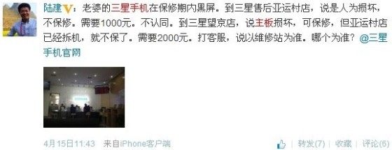还有对于同样的问题,不同售后要价不一、出现乱象的情况。网友陆建说:“老婆的三星手机在保修期内黑屏。到三星售后亚运村店,说是人为破坏,不保修。需要1000元。到三星望京店,说主板损坏,可保修,但亚运村店已经拆机,就不保了。打客服,说以维修站为准。哪个为准?”