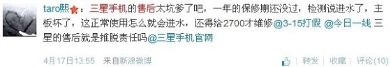 而此类案件并不是个例。其中网友taro熙称,“三星手机的售后太坑爹了吧,一年的保修期还没过,检测说进水了,主板坏了,这正常使用怎么就会进水,还得给2700才维修。”