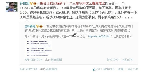 《国际电子商情》首席分析师孙昌旭微博写到,“一个GS3/GS4的供应商告诉我,GS3屏非常易裂的原因是,为了漂亮,周边打磨成2.5D,但没有想到对应力造成破坏,所以很易裂(难怪我的也裂)。此外还有一个BUG是易烧主板。所以GS4急着推出,且周边是平的,再不敢采用2.5D。”