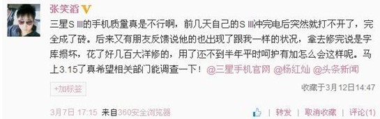 而除此外,还有网友曝出自己使用的note2也出现了裂屏,“买了15天的三星note2就是那么的。。。水。。。。裂缝加黑屏。”