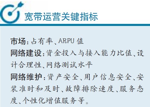 余猛介绍说,评价运营商宽带运营好坏有几个标准,市场方面主要体现在占有率、ARPU值;网络方面体现在投入资金与接入能力的比值;维护方面体现在服务的标准化、专业化等方面。
