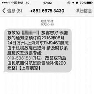 7月份,重庆女孩小文(化名)花800元购买了8月24日上午11点半自重庆万州飞往上海浦东的FM9462航班。8月24日早上6点左右,她收到一个来自“+85266753430”的短信,“通知”航班因机械故障已取消,要求她拨打航班改签退票专线联系。