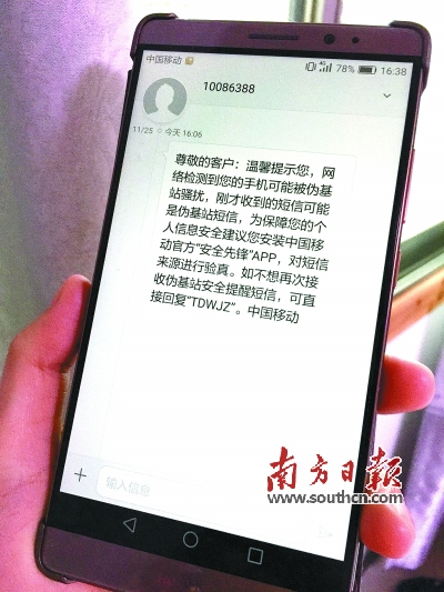 “尊敬的客户:温馨提醒您,网络监测到您的手机可能被伪基站骚扰,刚才收到的短信可能是伪基站短信……”,连日来,部分佛山市民在收到不知名短信后,马上收到由10086发出的提醒短信。