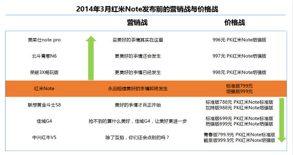 2014年3月红米Note发布前的营销战与价格战最为典型,大品牌如华为荣耀3X畅玩版、中兴红牛V5、联想黄金斗士S8均参与其中,还有一些不知名的小品牌。套路很简单,就是死磕。而小米也荣升为诸多互联网手机品牌发布会上的友商。