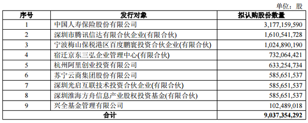 本次非公开发行的发行对象为中国人寿保险股份有限公司、深圳市腾讯信达有限合伙企业(有限合伙)、宁波梅山保税港区百度鹏寰投资合伙企业(有限合伙)、宿迁京东三弘企业管理中心(有限合伙)、杭州阿里创业投资有限公司、苏宁云商集团股份有限公司、深圳光启互联技术投资合伙企业(有限合伙)、深圳淮海方舟信息产业股权投资基金(有限合伙)、兴全基金管理有限公司,共计9名特定对象。所有发行对象均以同一价格认购本次非公开发行的股票,且均为现金方式认购。根据发行对象与公司签订的《股份认购协议》,各发行对象拟认购股份数量情况如下: