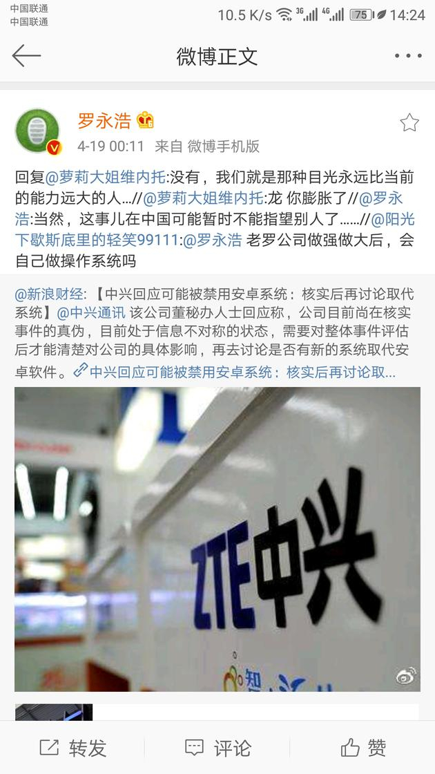 新浪科技讯 4月19日下午消息,对于中兴或被禁用Android(安卓)的消息,锤子科技CEO罗永浩今日在个人微博称,锤子做大做强后会自研操作系统。