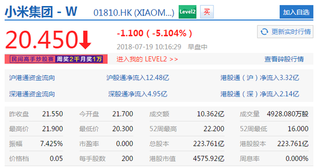 新浪科技讯 7月19日上午消息,小米(01810.HK)股价开盘报21.70港元,盘中下跌5.10%。截至10点16分小米市值4575.92亿港元,约583.02亿美元;成交约4928万股,涉资10.36亿港元。