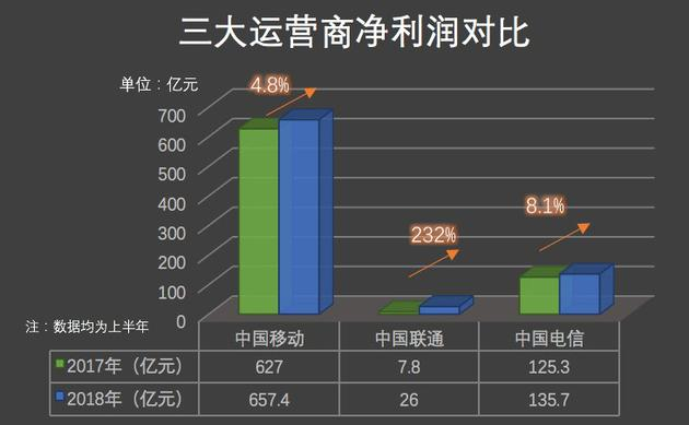 三家财报显示,上半年,共实现了853亿净利润,其中中移动的利润增长稳定,达到657亿,该数据是电信的近5倍。流量方面,中移动的增长为153%,联通增长220%,电信流量增长近4倍。