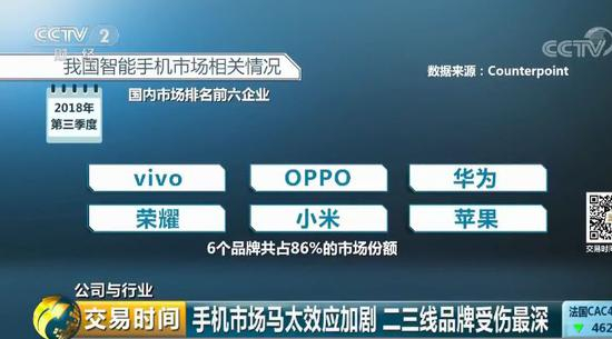 根据统计公司Counterpoint发布的2018年第三季度中国智能手机销量排名来看:国内市场排名前六的企业:vivo、OPPO、华为、荣耀、小米、苹果,6个品牌共同分食了86%的市场份额,手机市场马太效应进一步加大。同时第三季度国内手机市场总销量为1.08亿部,同比下滑13%。