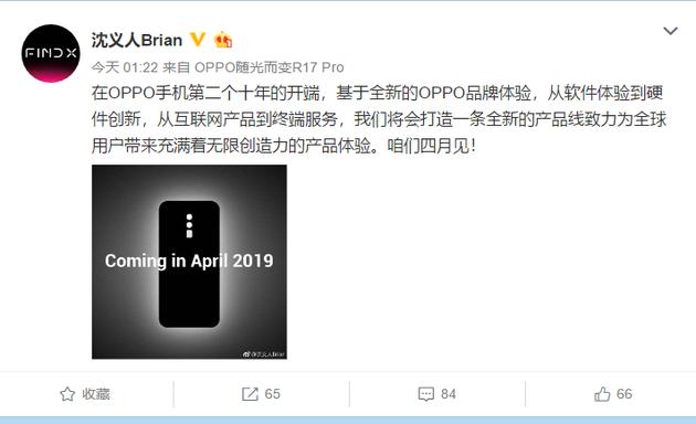 在采访最后,沈义人透露,今年OPPO会有新系列产品的发布。而在微博上,他进一步爆料称,基于全新的OPPO品牌体验,从软件体验到硬件创新,从互联网产品到终端服务,OPPO将会打造一条全新的产品线。而该新系列的产品将在4月正式发布。