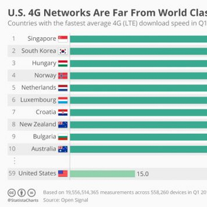 然而,在基础设施上,美国的家庭宽带或无线宽带速度,不是世界最佳水平。根据OpenSignal最近的一份报告,美国的4G平均下载速度为14.99 Mbps,全球排名第59位,这不到新加坡移动设备用户三分之一,位列第一的新加坡4G平均下载速度是45.62 Mbps。韩国的4G平均下载速度排名全球第2,4G平均下载速度为43.46 Mbps,澳大利亚排名第10,4G平均下载速度为33.76 Mbps。
